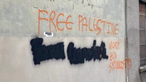 Fig. 1. « Free Palestine. Mort aux sionistes. Israël génocide [mention barrée] ». Graffitis rue Faÿs à Villeurbanne dans la rue du lycée du même nom, visibles entre fin novembre 2024 et février 2025.