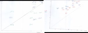 Fig. 3. Graphiques réalisés en groupe par les élèves de terminale spécialité HGGSP mesurant la fiabilité (en ordonnée) et la pertinence (en abscisse) de chaque document des corpus documentaires fournis. En vert (à gauche) et en rouge les documents soutenant le récit palestinien, en bleu, les documents soutenant le récit israélien. Novembre 2024, Lycée Faÿs, Villeurbanne.