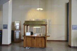 Un des tours de magie du dispositif muséographique est ici de neutraliser, autrement dit, de rendre inoffensive cette cabine qui était, du temps de son premier fonctionnement, porteuse autant d’espoir que de frayeur.